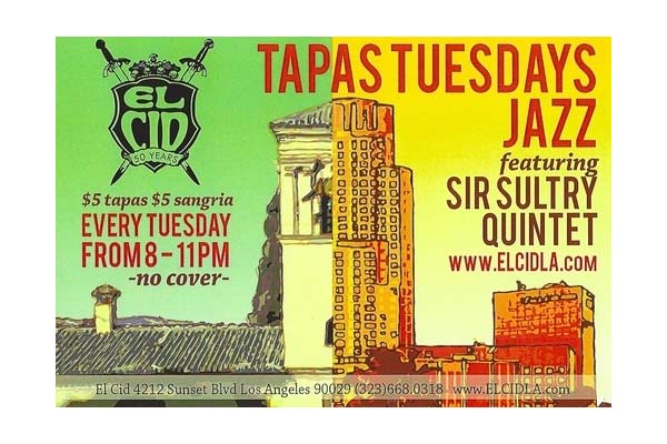 We are thrilled to announce that The Sir Sultry Quintet performs every Tuesday at El Cid for Tapas Tuesdays. Performing a mix of jazz, blues and flamenco, the group is led by guitarist/composer Ethan Margolis.